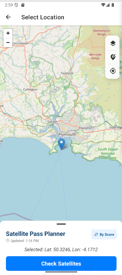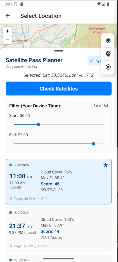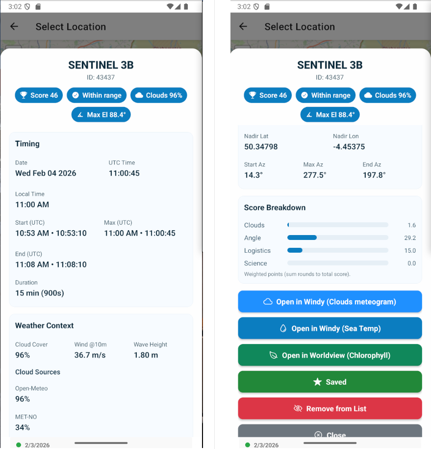 Tapping a pass reveals the exact Max Elevation, Azimuth, and Off-Nadir Angle required for mission planning.